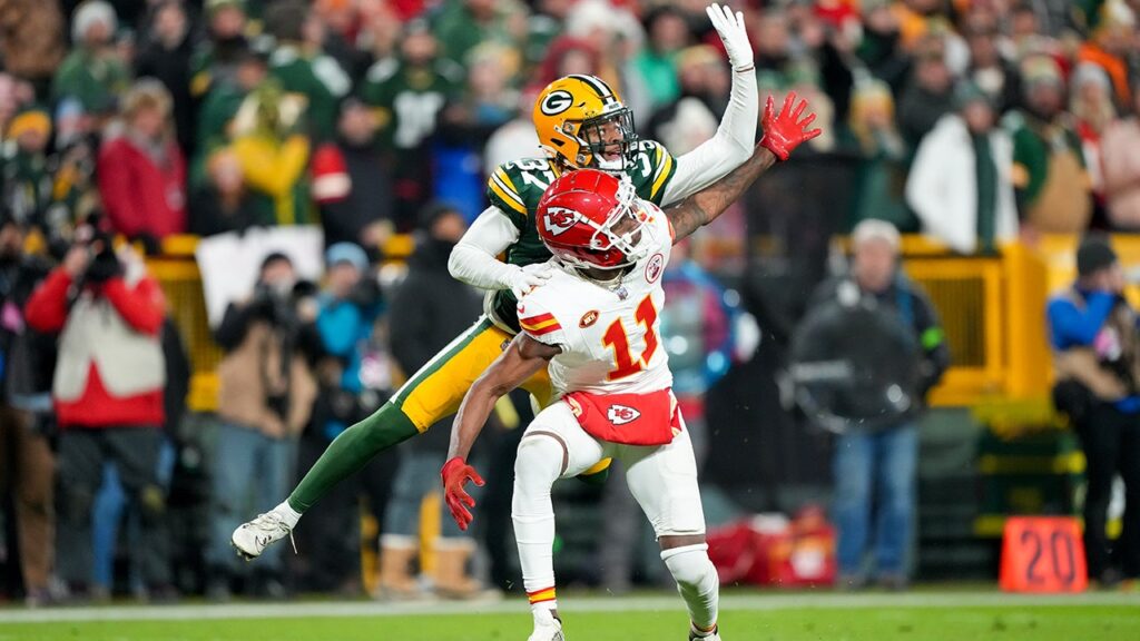 With 50 seconds left in the game, Mahomes threw a deep pass targeted at Marquez Valdes-Scantling. It appeared Packers cornerback Carrington Valentine was draped all over Valdes-Scantling and got to him before the ball arrived. However, officials held the flag.