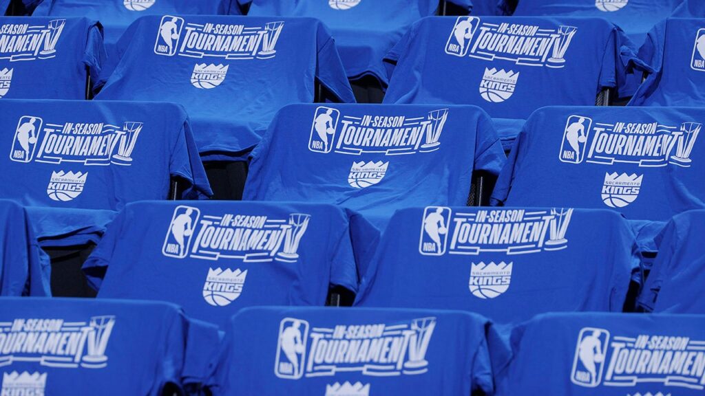 A view of the In-Season Tournament shirts in the arena before the game between the New Orleans Pelicans and the Sacramento Kings during the quarter-finals of the In-Season Tournament on Dec. 4, 2023 at Golden 1 Center in Sacramento, California. (Rocky Widner/NBAE via Getty Images)