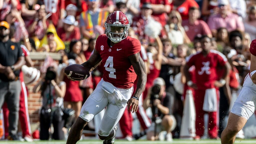 Alabama quarterback Jalen Milroe (4) runs the ball against Tennessee during the first half of a game Saturday, Oct. 21, 2023, in Tuscaloosa, Ala. (AP Photo/Vasha Hunt)