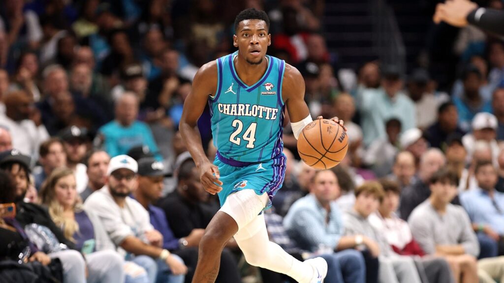 Brandon Miller #24 of the Charlotte Hornets brings the ball down the court during the second half of a basketball game against the Atlanta Hawks at Spectrum Center on October 25, 2023 in Charlotte, North Carolina. NOTE TO USER: User expressly acknowledges and agrees that, by downloading and or using this photograph, User is consenting to the terms and conditions of the Getty Images License Agreement. (David Jensen/Getty Images)